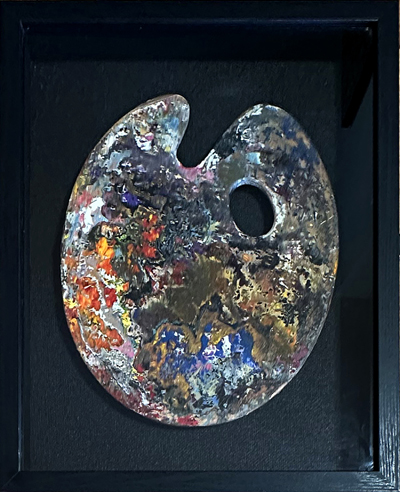 10 year old palette, sanded, varnished and attached inside a shadow box